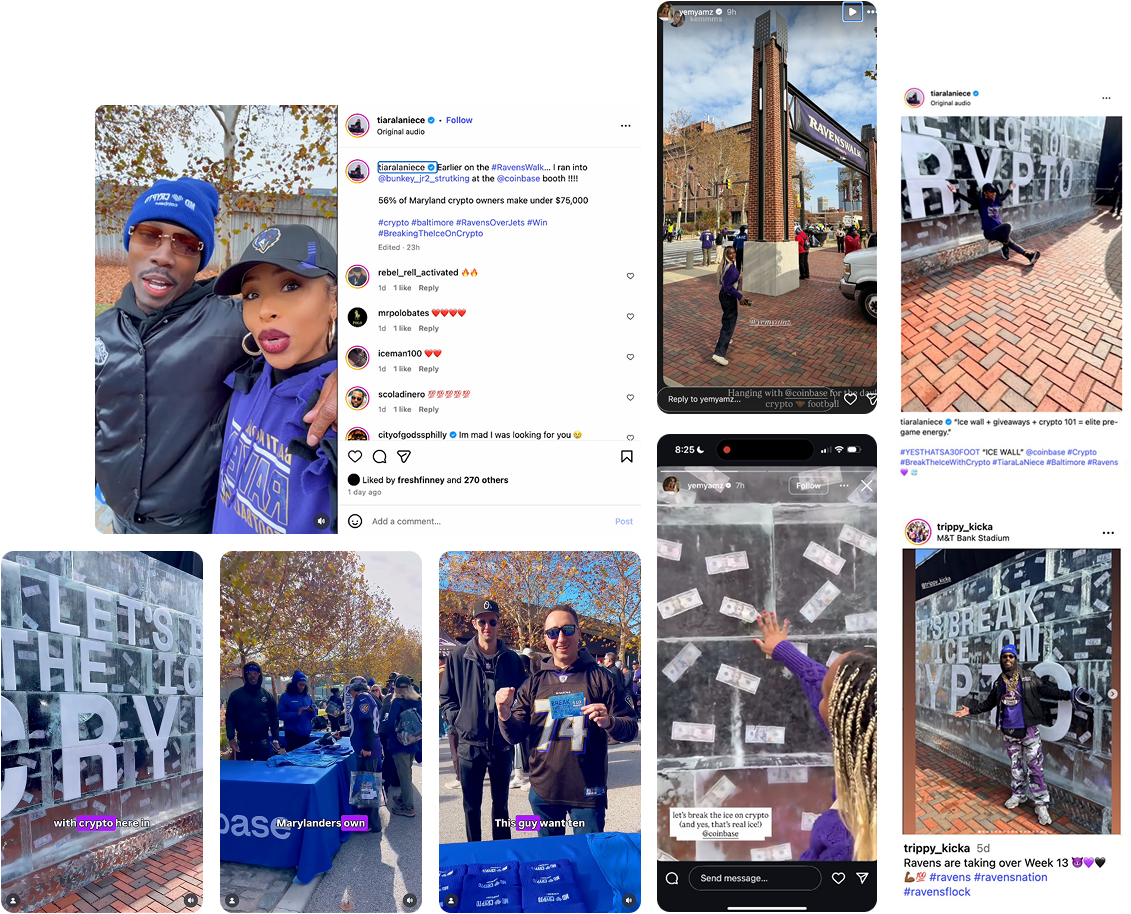 Installed outside M&T Bank Stadium before a Raven's game, the ice wall became a live, participatory experience. Attendees were invited to engage with the installation, capture photos, learn how crypto works, and why staking is currently unavailable in Baltimore.